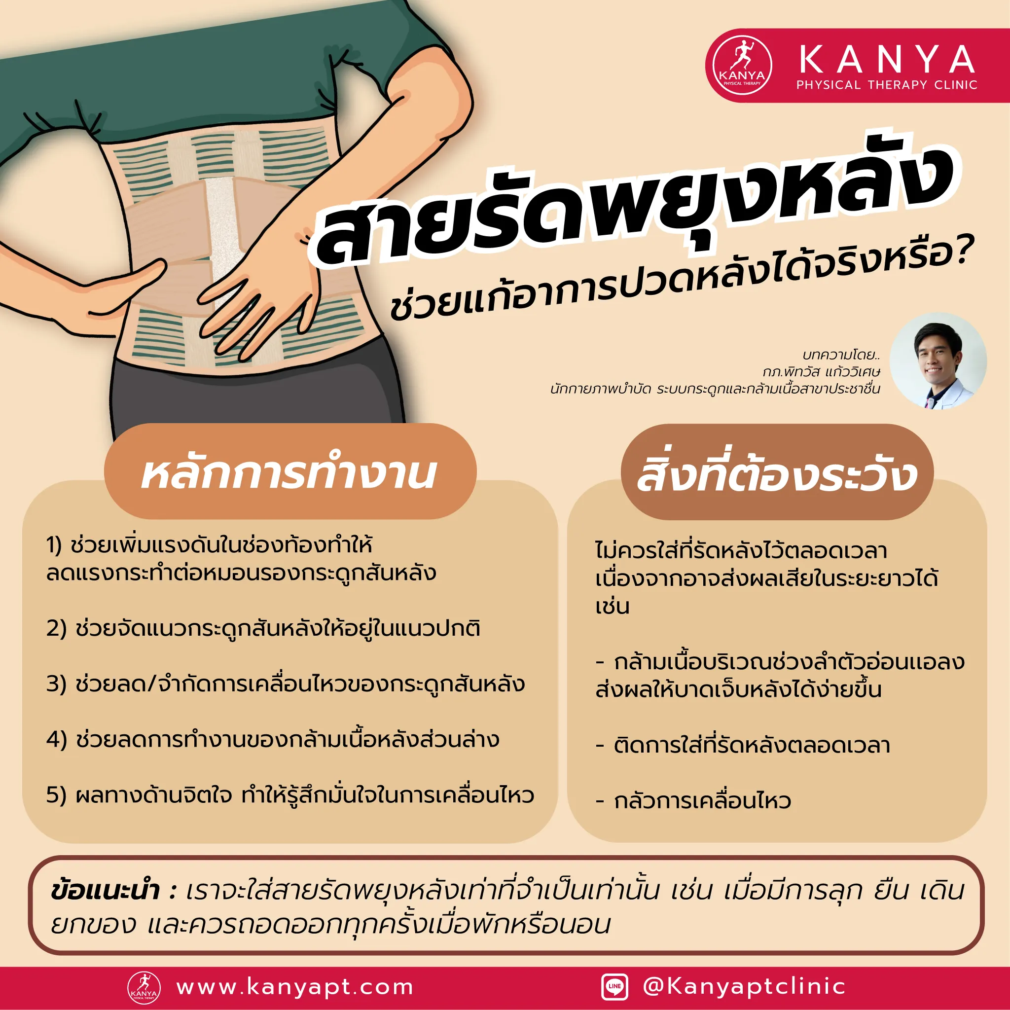 หลายคนเมื่อมีอาการปวดหลัง ก็มักจะพยายามหาวิธีต่างๆเพื่อลดอาการปวดที่เกิดขึ้น หนึ่งในนั้นก็อาจจะเลือกใช้ สายรัดพยุงหลัง (Back Support หรือ L-S Support) ซึ่งเป็นอุปกรณ์ที่หาซื้อได้ง่าย และเมื่อสวมใส่เเล้วมักทำให้รู้สึกปวดลดลง จึงเลือกที่จะใส่ไว้ตลอดเวลา ทั้งในขณะทำงาน และทำกิจวัตรประจำวัน เพราะเชื่อว่าที่รัดพยุงหลังนี้จะช่วยป้องกันอาการปวดได้ จนผู้สวมใส่เริ่มรู้สึกคุ้นชิน หากวันใดไม่ได้ใส่ก็จะกลัวเจ็บหรือรู้สึกไม่สบายหลัง