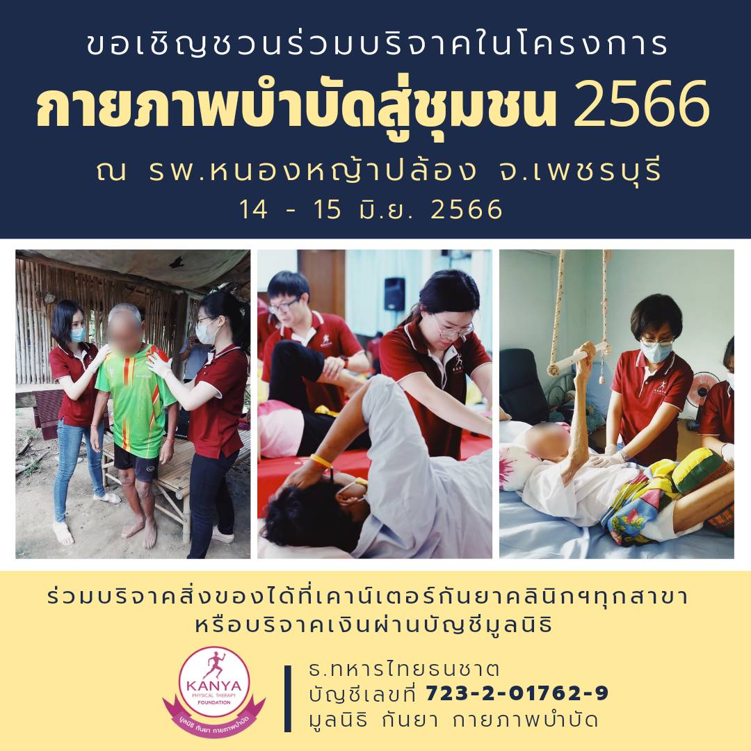 มูลนิธิ กันยา กายภาพบำบัด ขอเชิญทุกท่าน ร่วมทำบุญบริจาคในโครงการ “กายภาพบำบัดสู่ชุมชน 2566” เพื่อช่วยเหลือประชาชนในพื้นที่ อ.หนองหญ้าปล้อง จ.เพชรบุรี ให้ได้เข้าถึงการดูแลด้านสุขภาพและการรักษาทางกายภาพบำบัดมากยิ่งขึ้นโดยไม่มีค่าใช้จ่าย